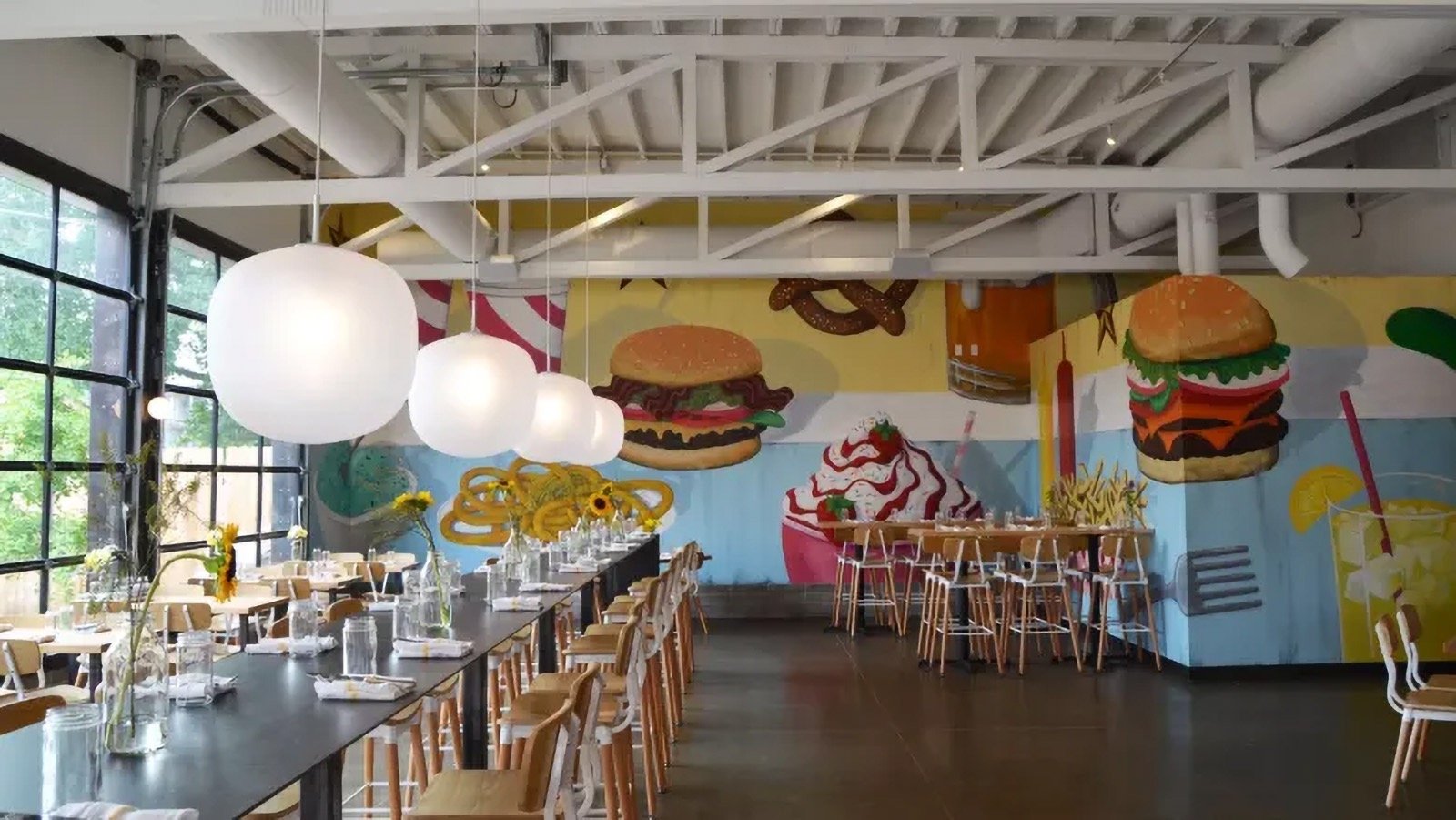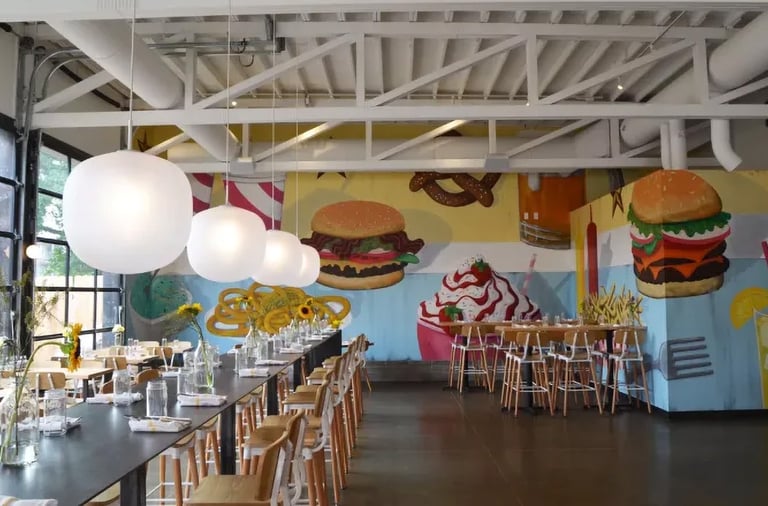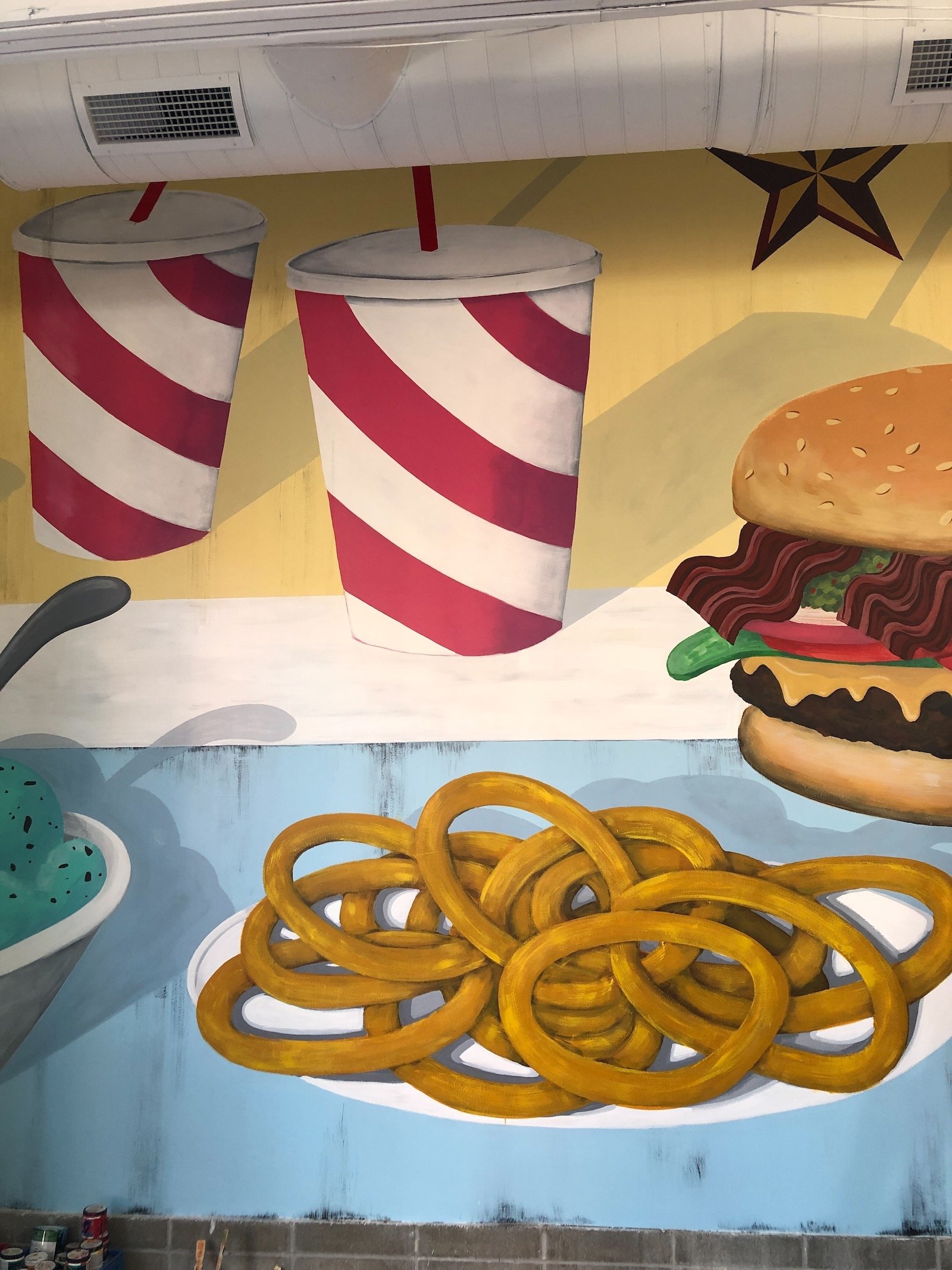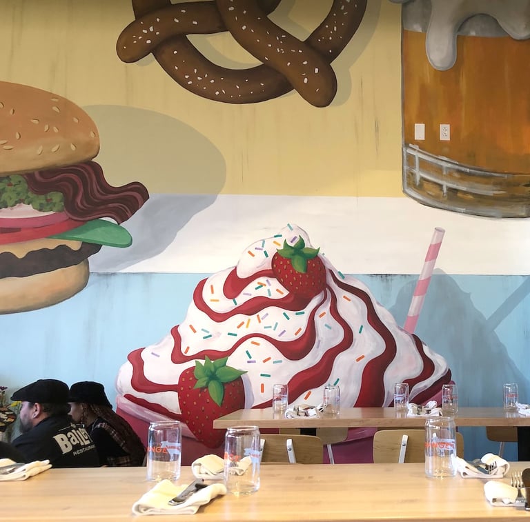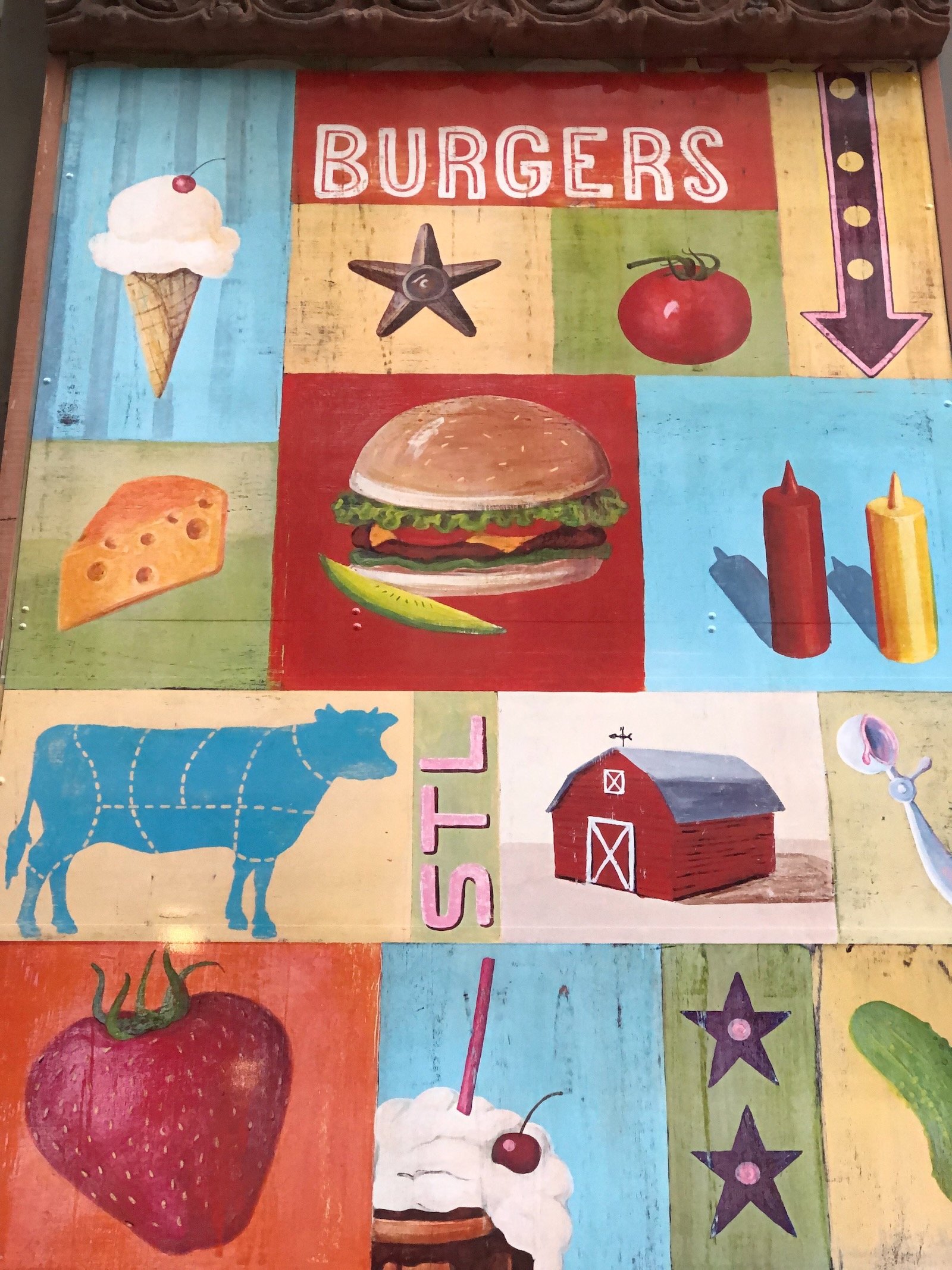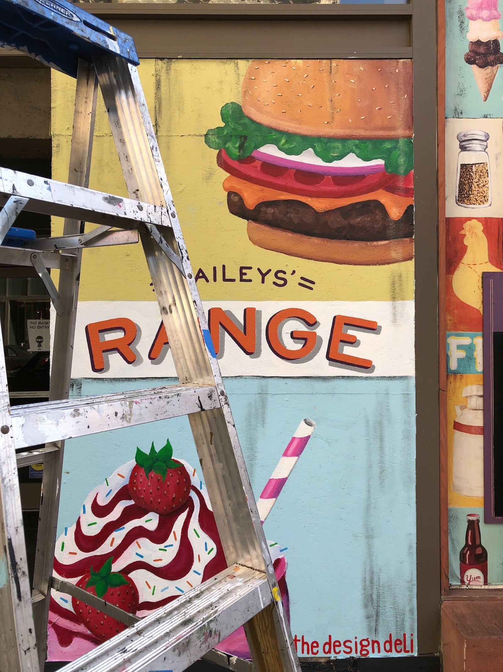 Bailey's Range owner, Kara Bailey, wanted a 'burgers and shakes' inspired mural that would bring life and color to the sterile white walls of new construction. The images are inspired by hand painted roadside signs.