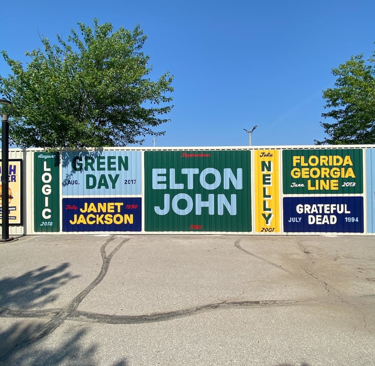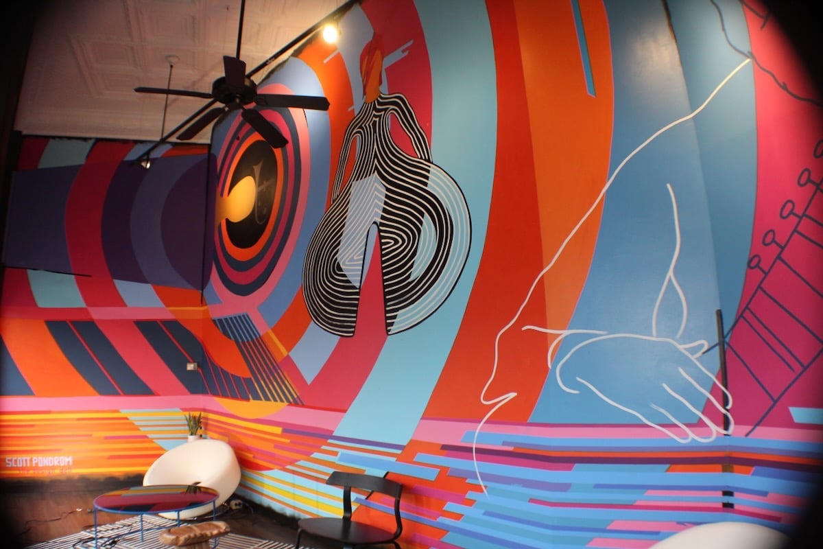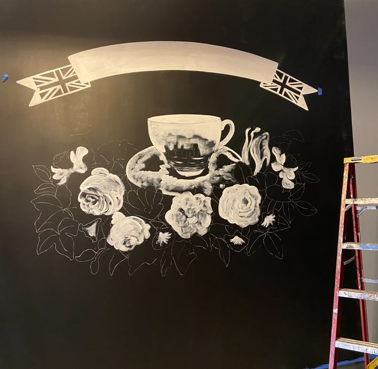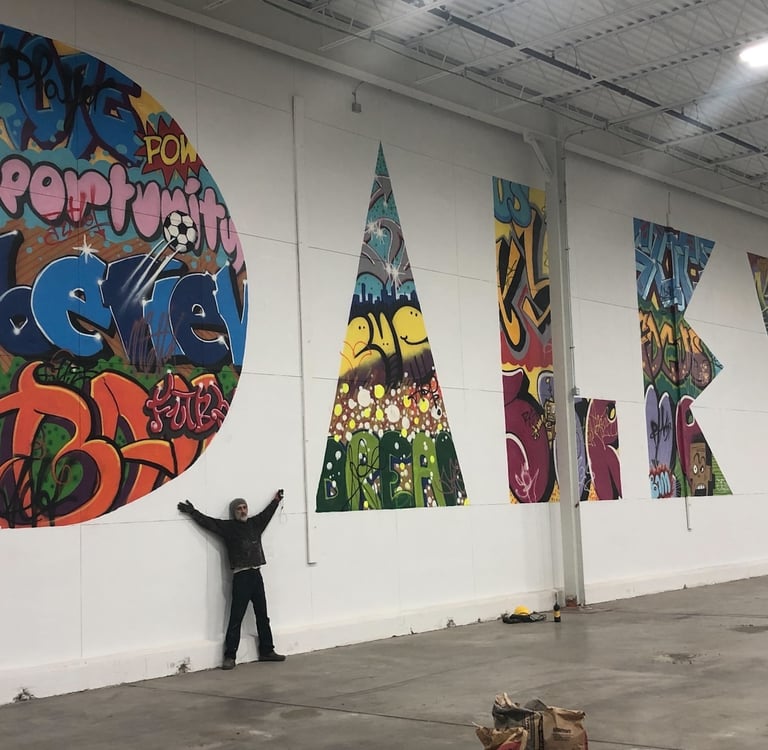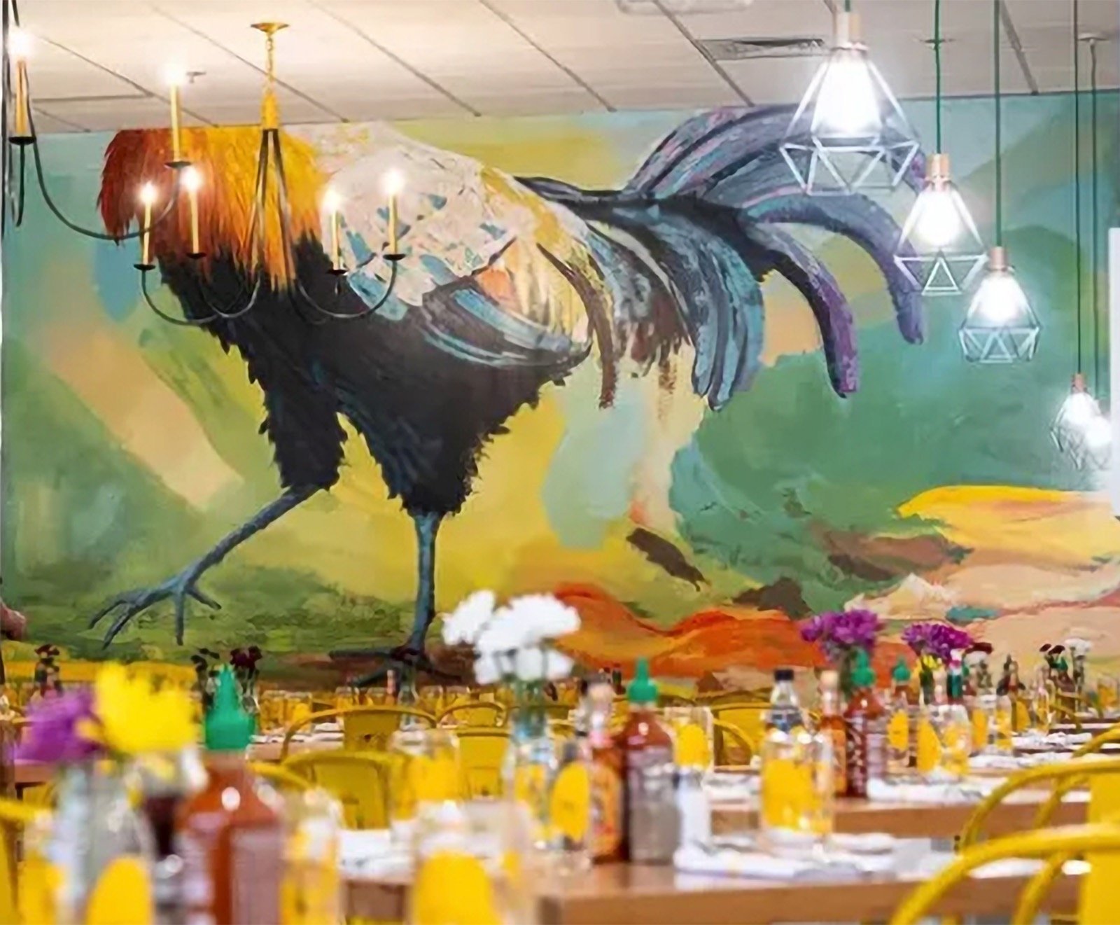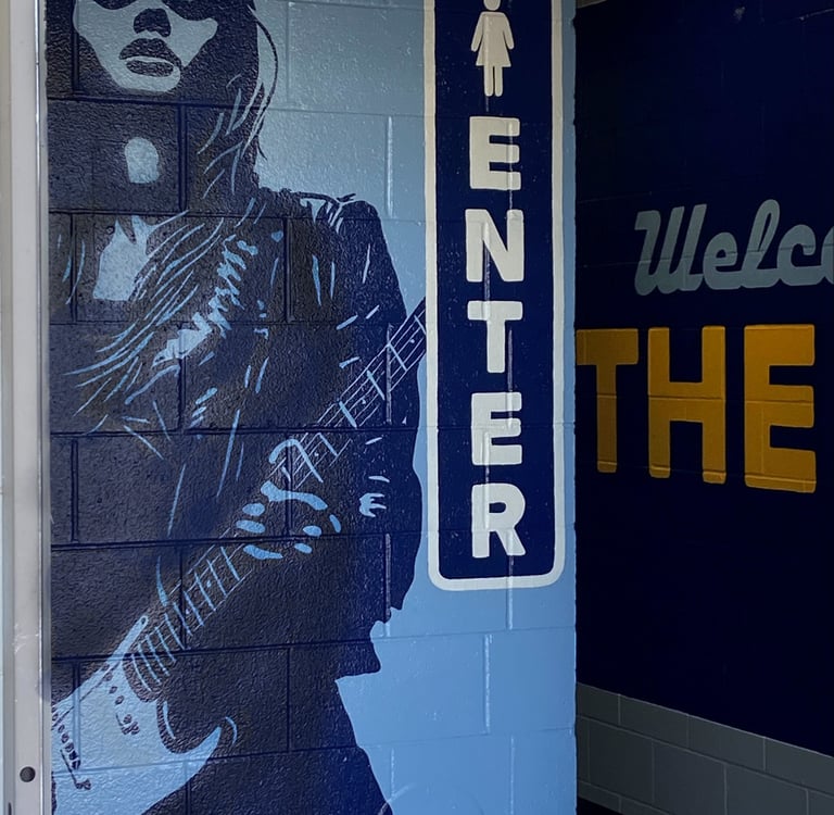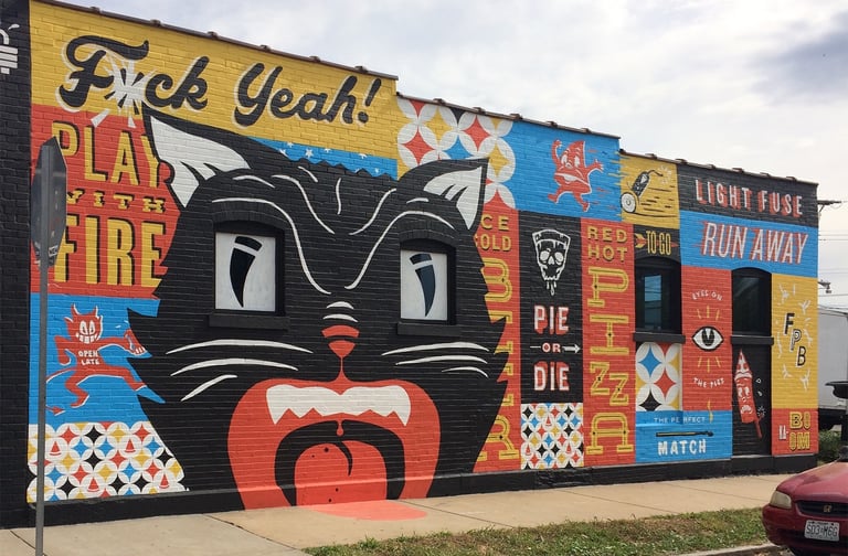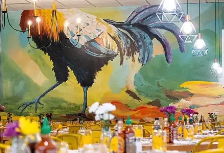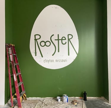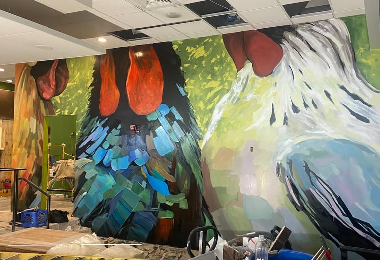 Bailey's Range owner, Kara Bailey, wanted a 'burgers and shakes' inspired mural that would bring life and color to the sterile white walls of new construction. The images are inspired by hand painted roadside signs.